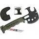 11.75" overall. 5" black oxide coated carbon steel axe head with 3.75" cutting edge. OD green GRN handle. Glass breaker. Belt/cord cutter. Lanyard hole. Features: 6" Milwaukee Sawzall blade, hammer head and claw, gas valve shut-off,hex wrench, bottle opener, can opener, box cutter, Hex sockets (3/8, 7/16, 1/2, 9/16, 10mm, 11mm, 13mm, 15mm), backed hex sockets (accepts any 1/4" bit), recessed nail puller, wire twist, and pry bar. Black nylon belt sheath. Boxed.