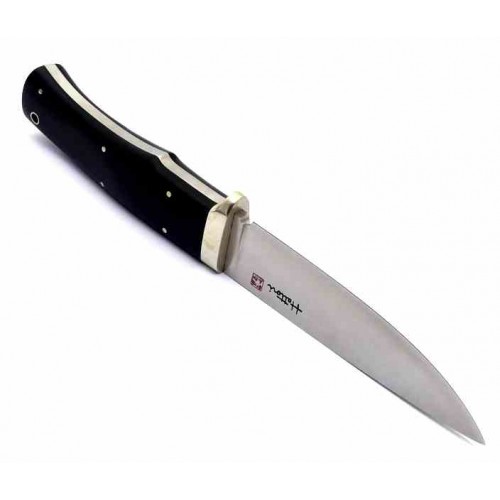Japanese knife made by the master Hattori Urban Hunter model with San Mai laminated blade with VG-10 stainless steel core and 420J2 stainless steel on the outside. Hamaguri-ba blade profile with semi-dropped tip. Polished micarta handle with 5 prongs and hole for a safety cord. Includes brown leather sheath to carry on your belt.