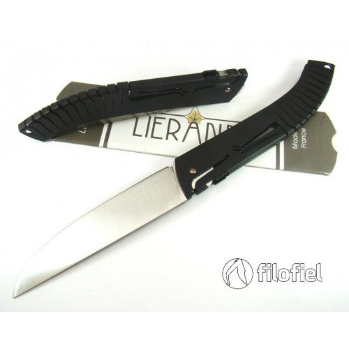 French knife Lierande LeThiers model in black color. The Thiers de Liérande is an ideal pocket companion, its one-piece stainless steel handle with back lock gives it exceptional lightness, it is elegant with its innovative design, and it is very safe to use (patented system).