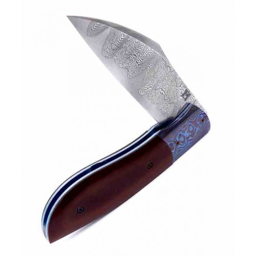 Impresionante navaja artesanal realizada por el checo Milan Mozolic de tipo Wharncliffe con la hoja de acero San Mai compuesto por un núcleo de acero carbono 1095 y dos láminas exteriores de acero damasco. Sistema de cierre de la hoja con bloqueo de tipo liner lock. Rodamientos cerámicos y forros (liners) de titanio 6AL9V. Virola de timascus. Cachas de micarta vintage. Se trata de una pieza única y exactamente la misma que usted ve en las fotos con certificado de autenticidad por el artesano. Pinche Play para ver el Video.